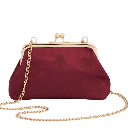 This Victoriana Embroidered Burgundy Satin Clutch Bag is a masterpiece of party elegance. Rich floral embroidery against sumptuous satin makes this the ultimate accessory for any upscale soiree. The chic gold chain strap allows for a seamless transition to hands-free convenience.